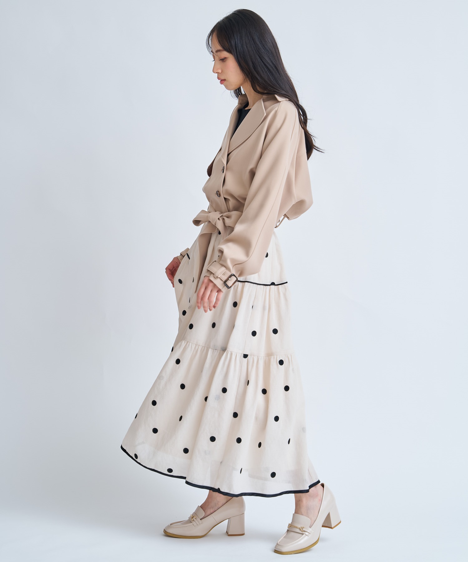 ウエストベルト付きで、結び方次第で印象を変えられるのも魅力です。