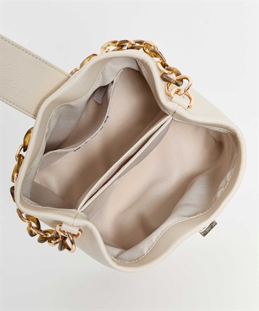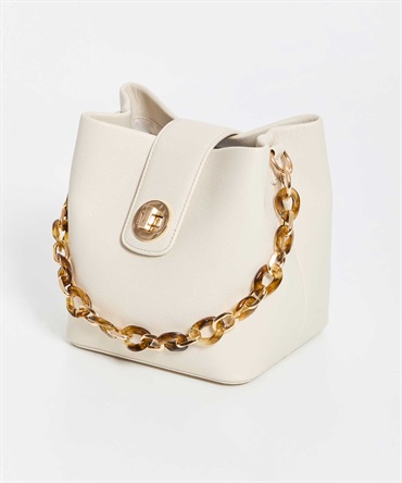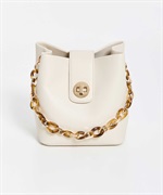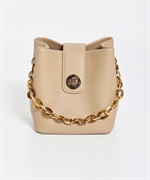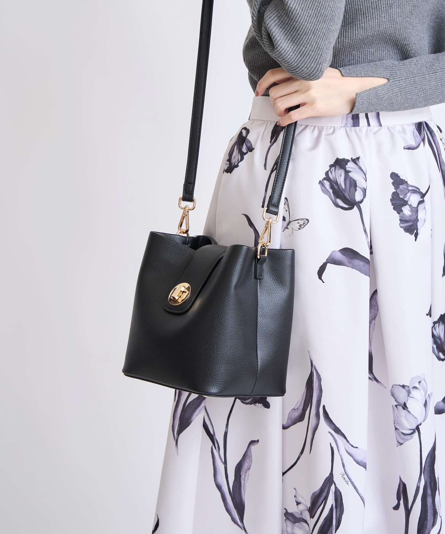 小ぶりで愛らしいバケツフォルムのデザインバッグ。