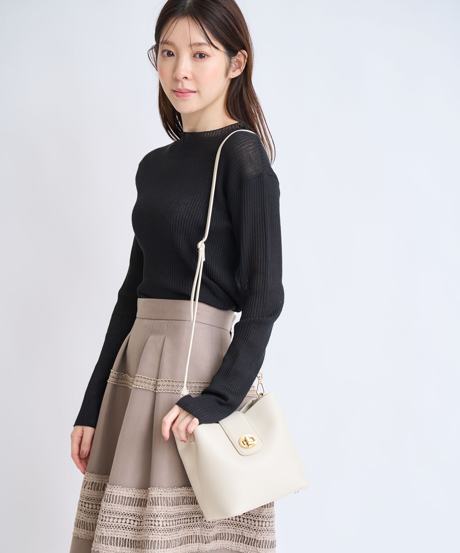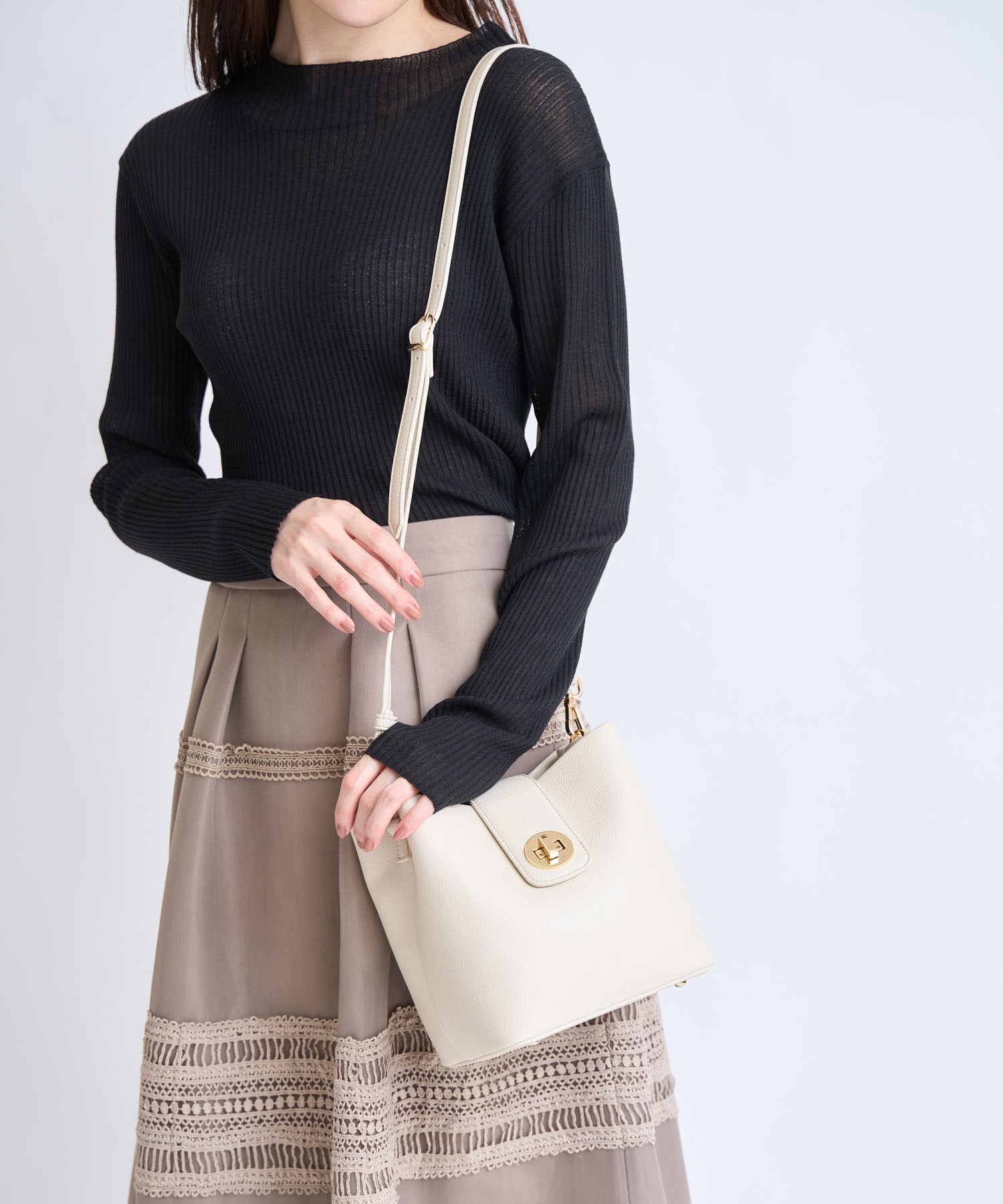 ゴールドのターンロックが上品なアクセントを添え、女性らしい印象に。