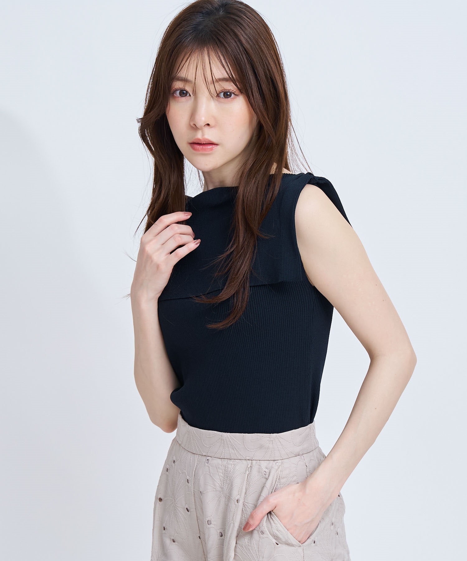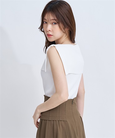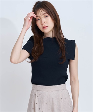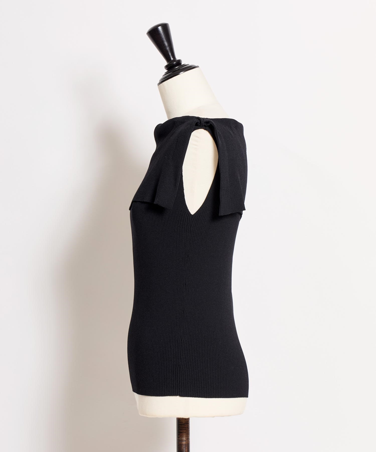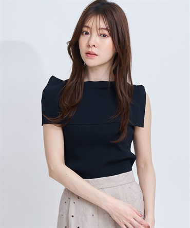 前後どちらでも着用できる2WAY仕様のノースリーブリブニット。