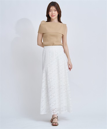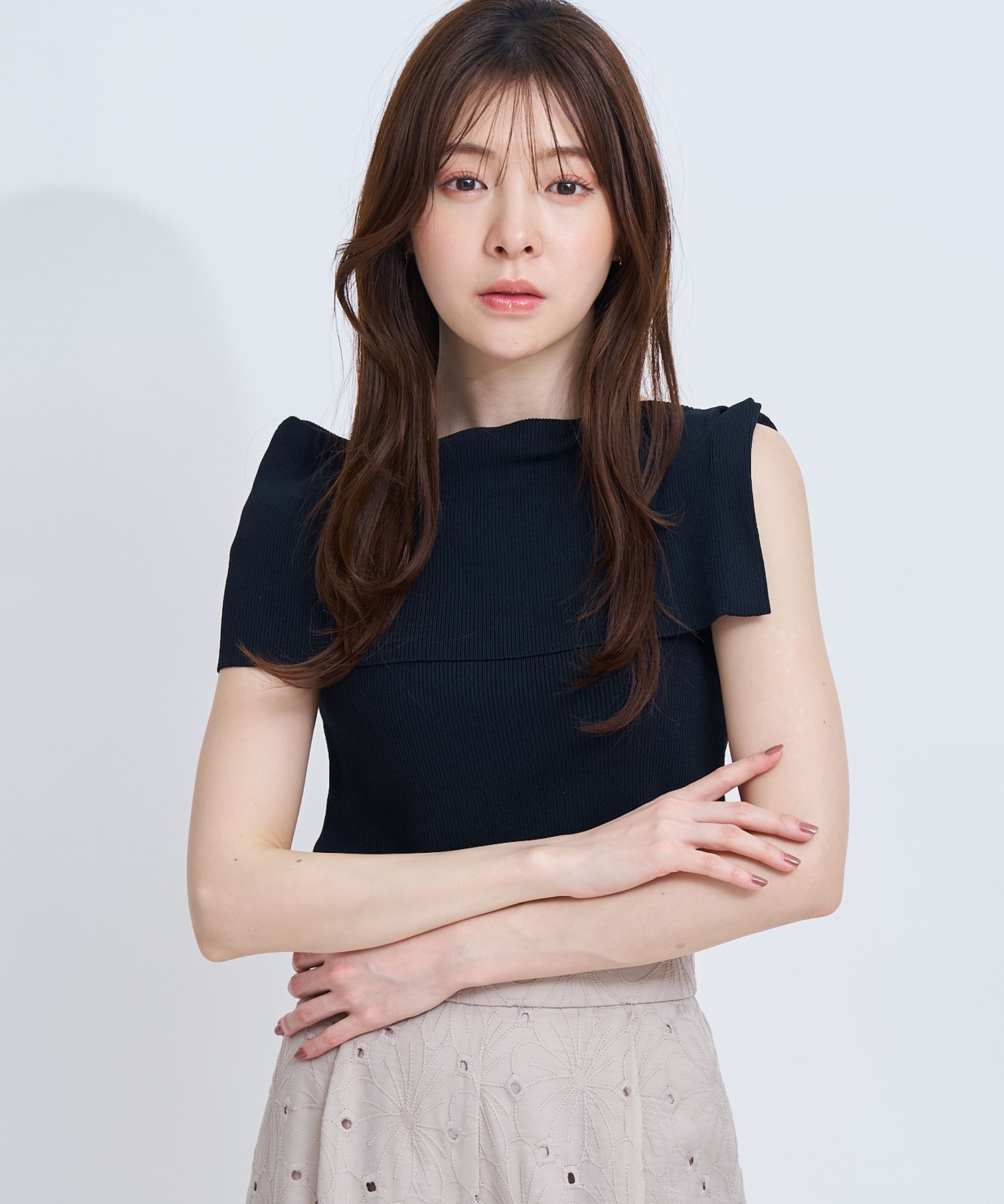 アシンメトリーなデザインが胸元に美しいドレープを生み、さりげなく華やかな印象に。