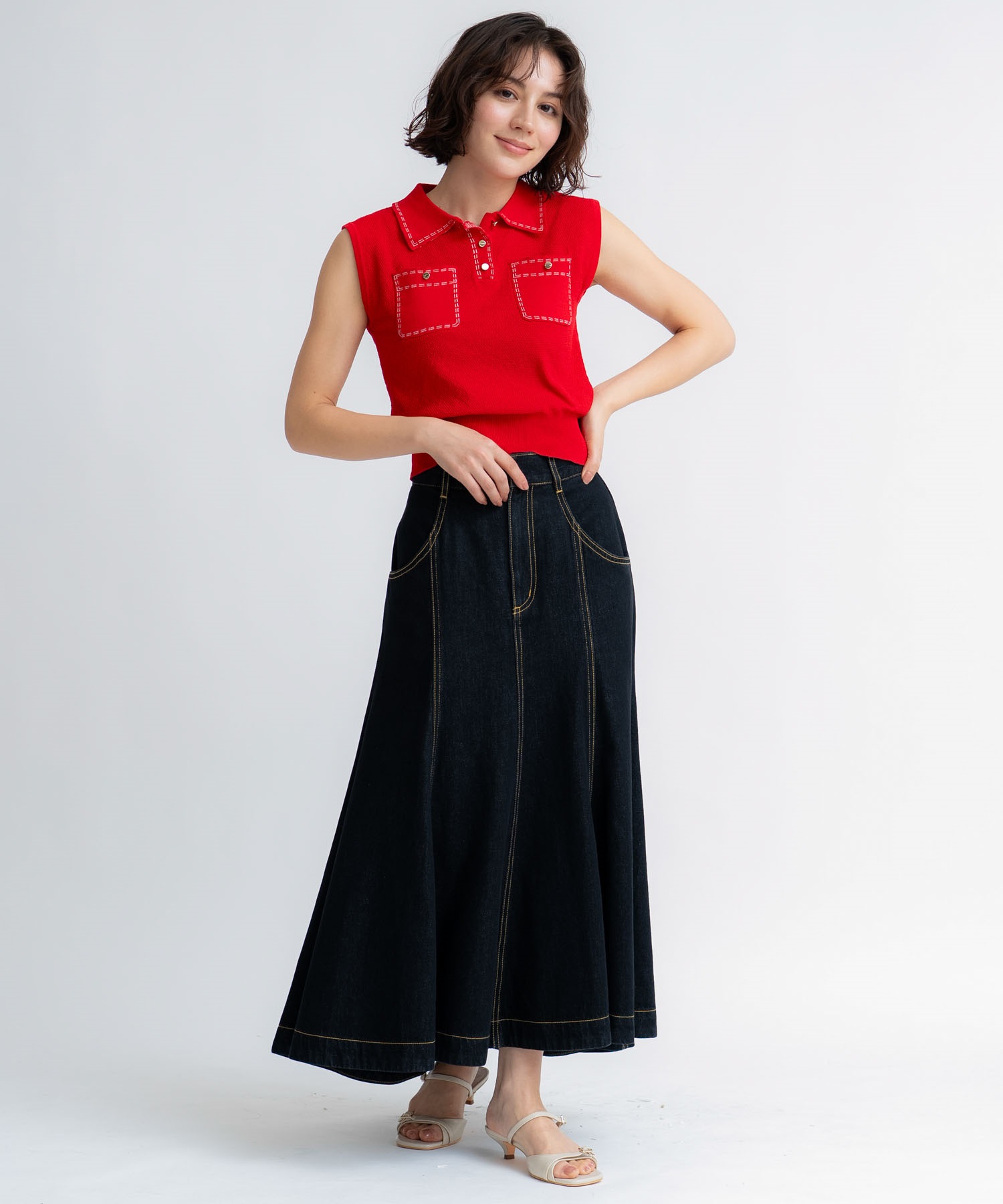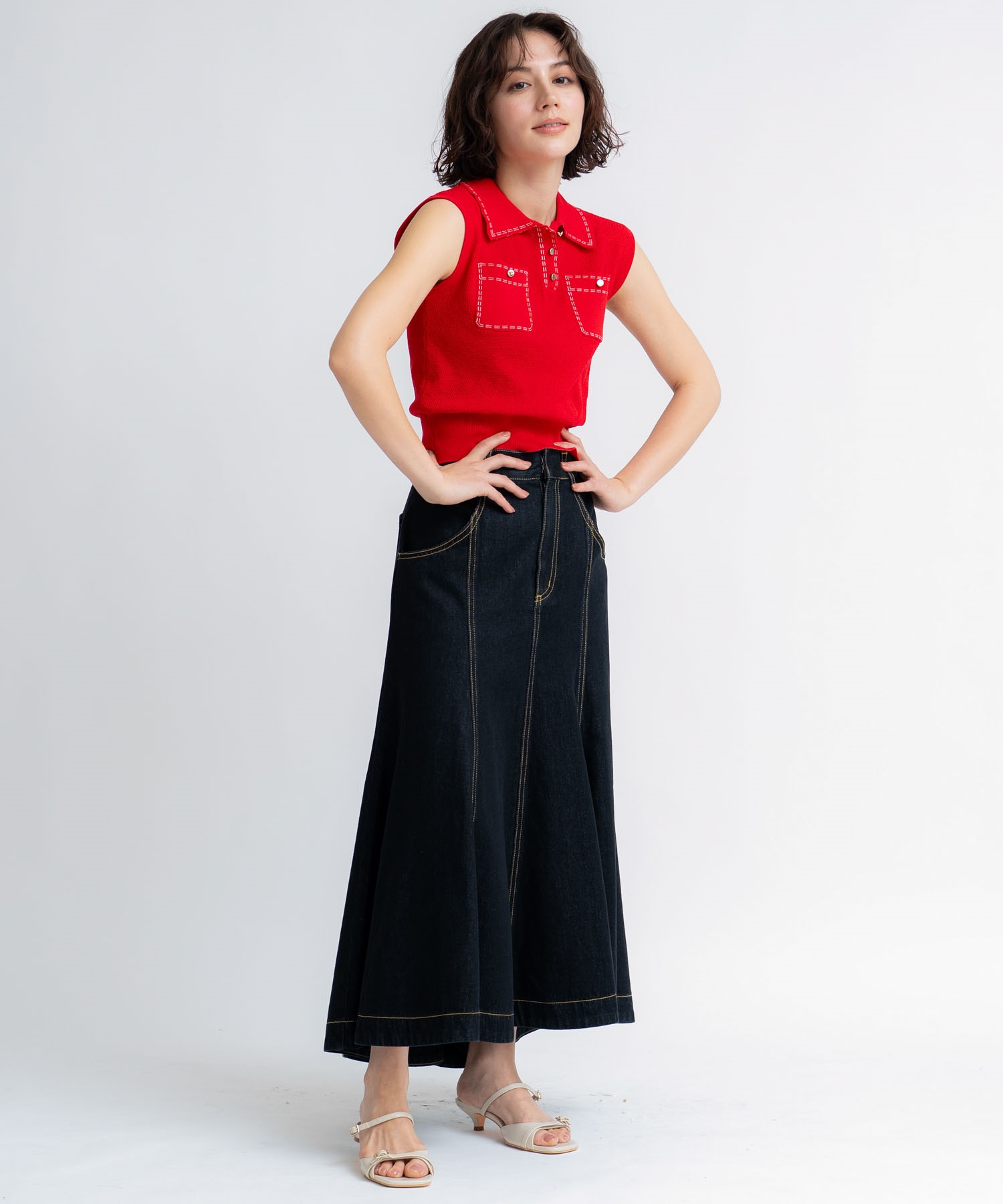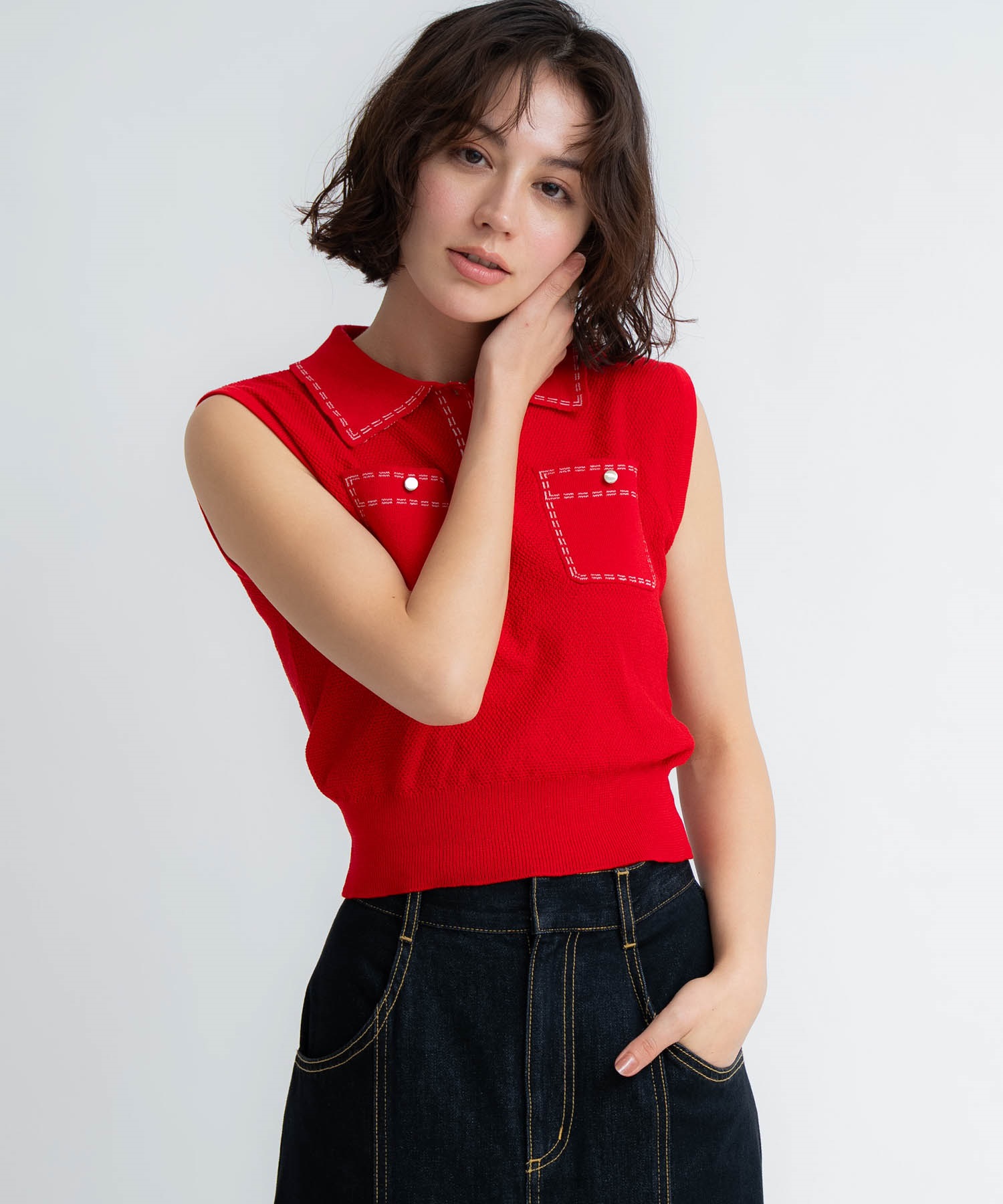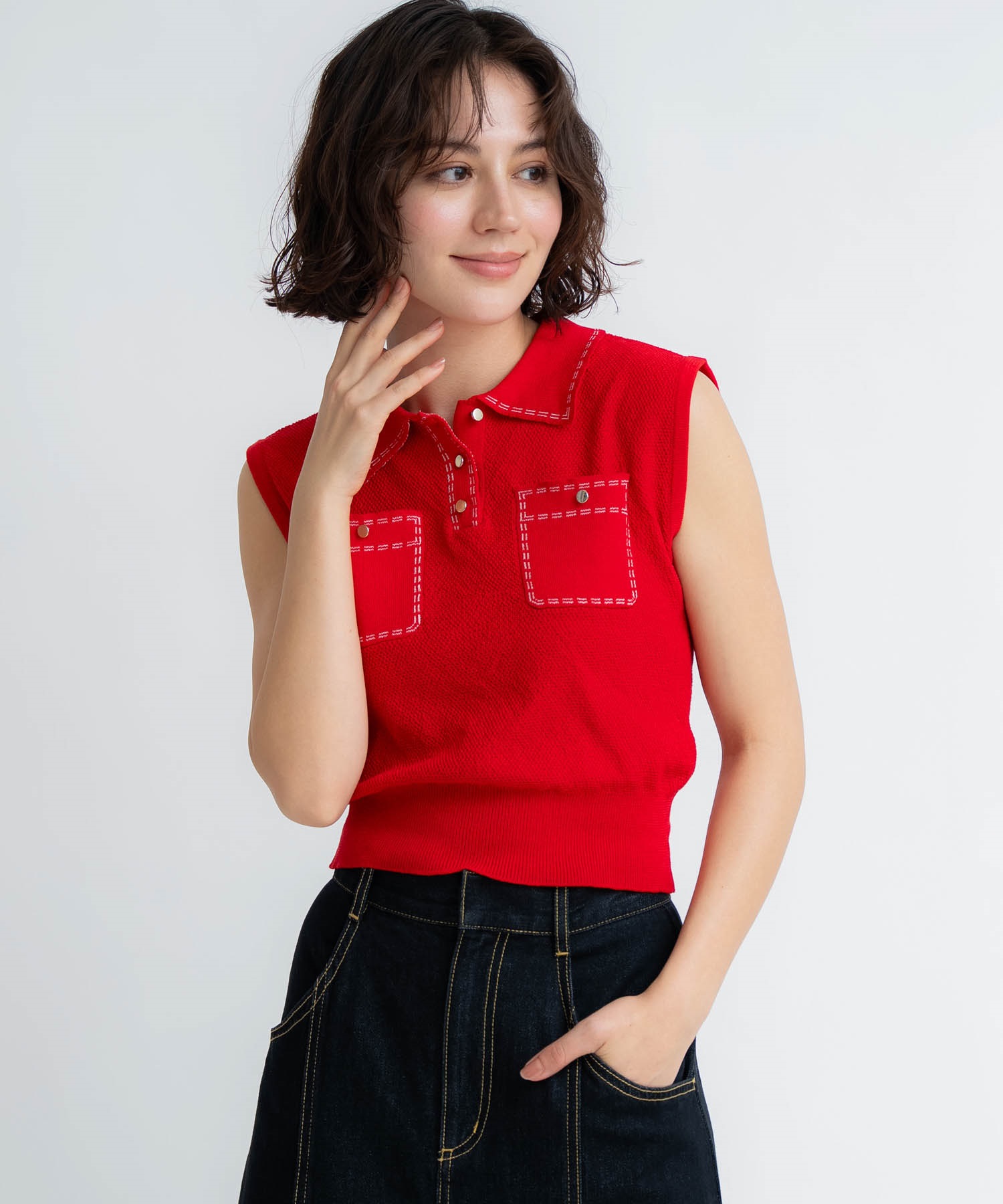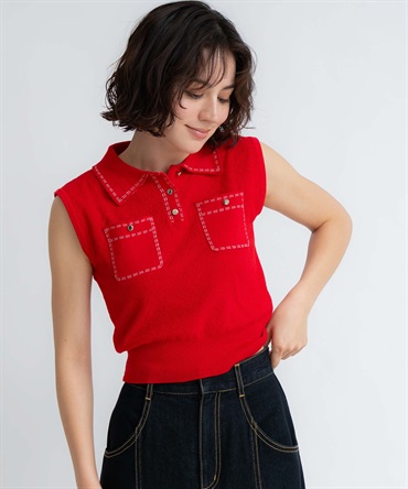 • 【予約】鹿の子編みステッチノースリポロニット(30レッド-フリー-5月下旬ごろのお届け)