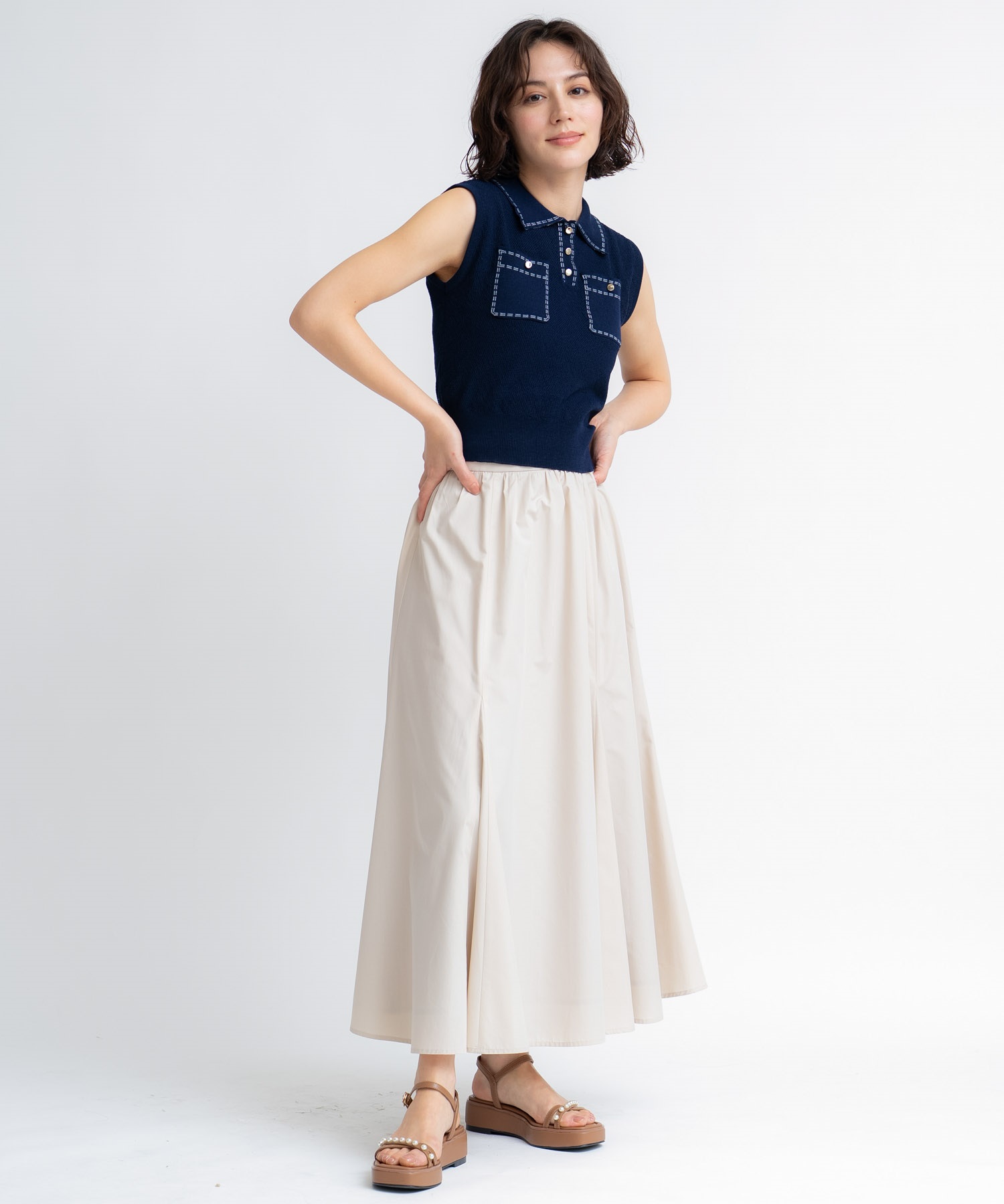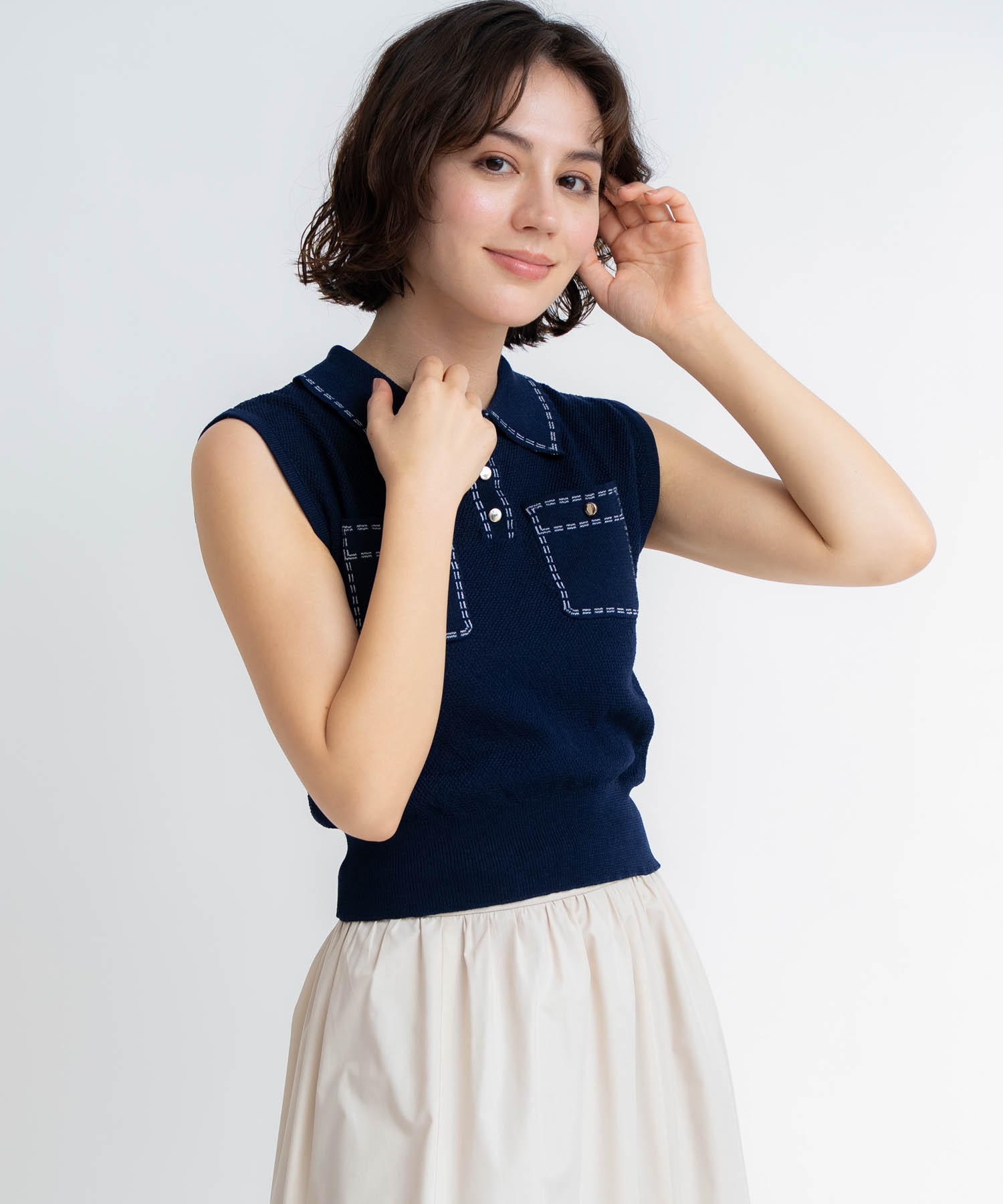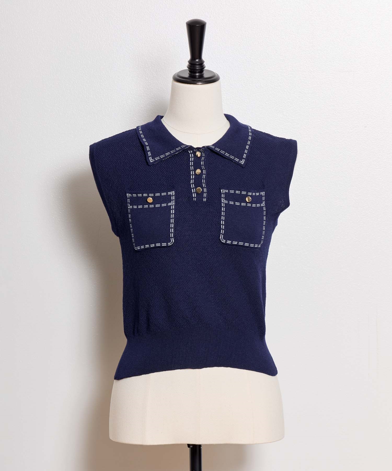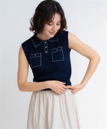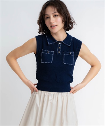• 【予約】鹿の子編みステッチノースリポロニット(70ネイビー-フリー-5月下旬ごろのお届け)