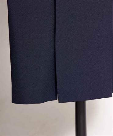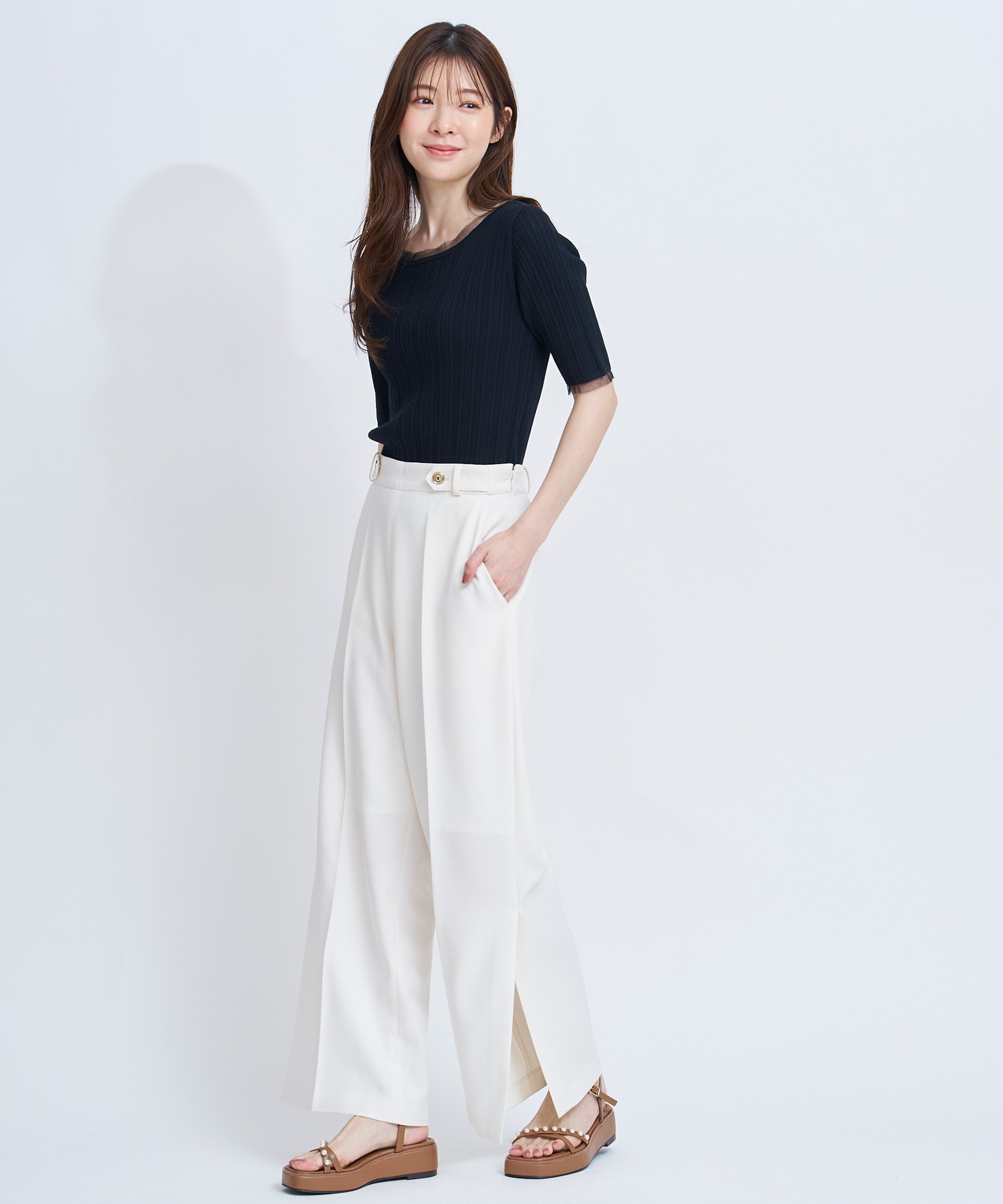 裾のスリットデザインが足元に抜け感を添え、歩くたびに軽やかな動きを演出。