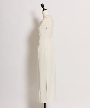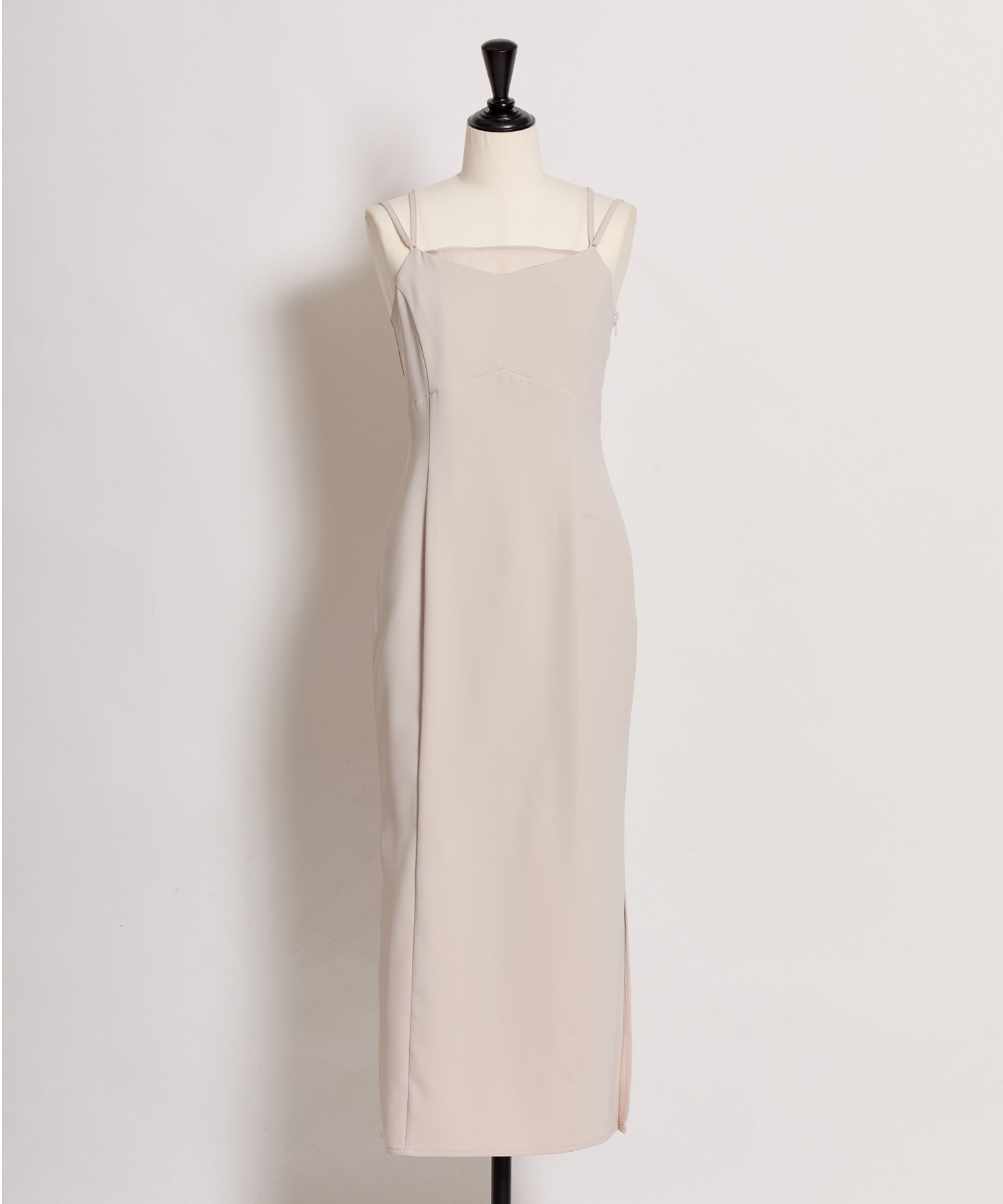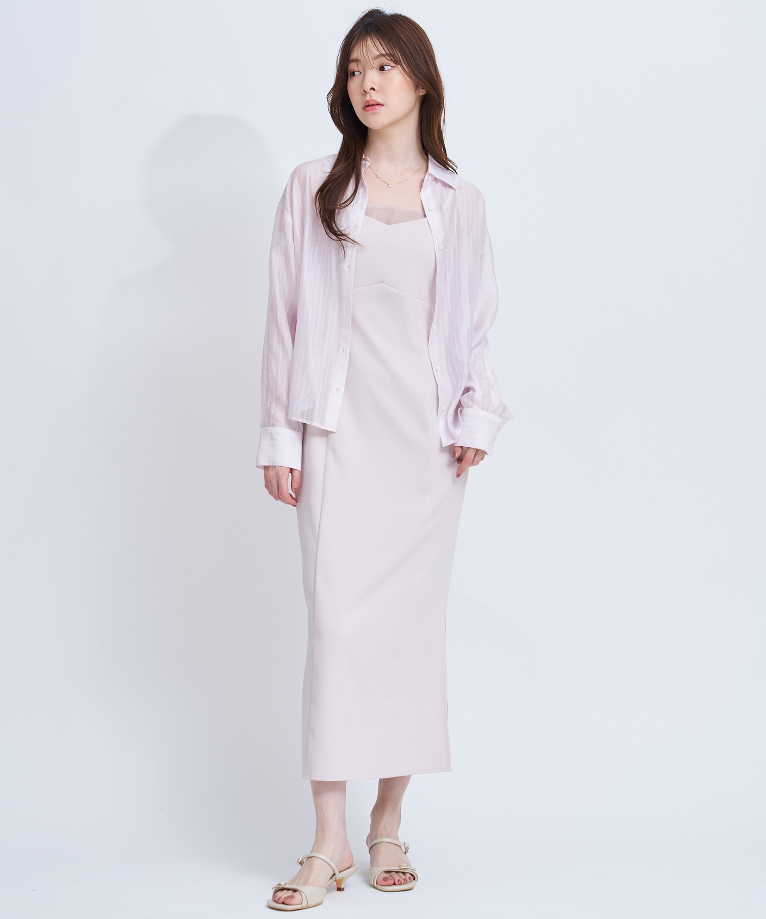 胸元からウエストにかけての切り替えとさりげない透け感が奥行きを生み、縦ラインを強調するすっきりとしたシルエットを演出します。