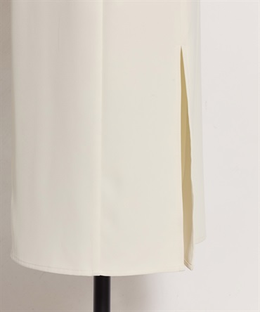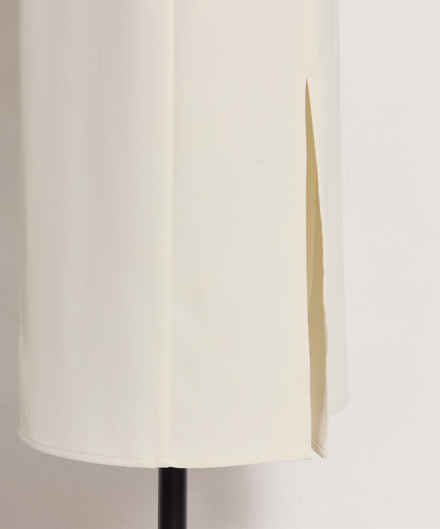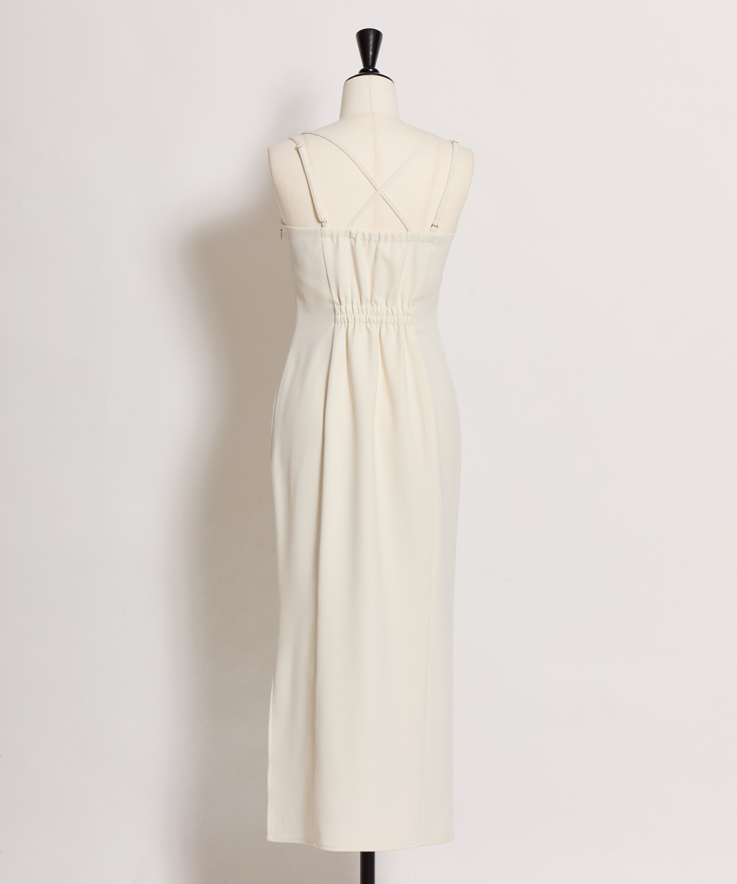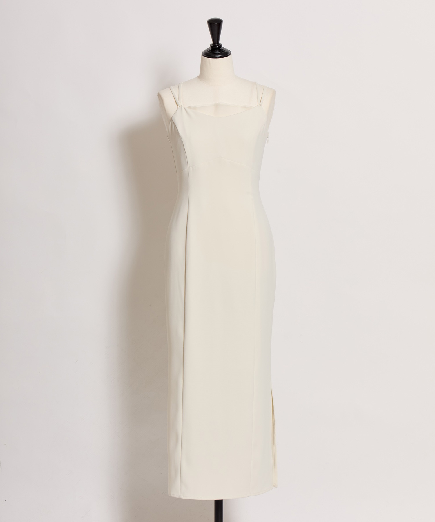 胸元からウエストにかけての切り替えとさりげない透け感が奥行きを生み、縦ラインを強調するすっきりとしたシルエットを演出します。