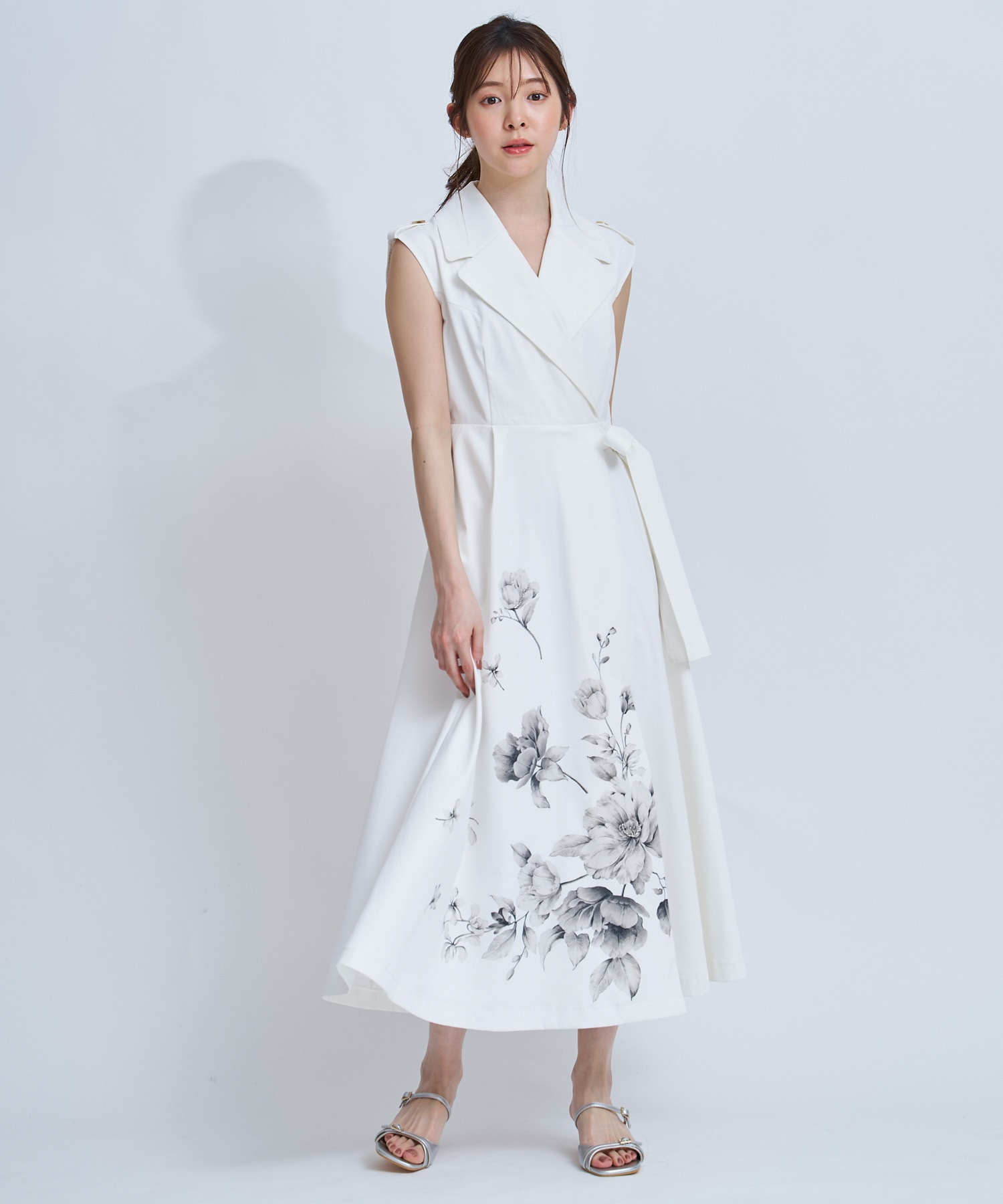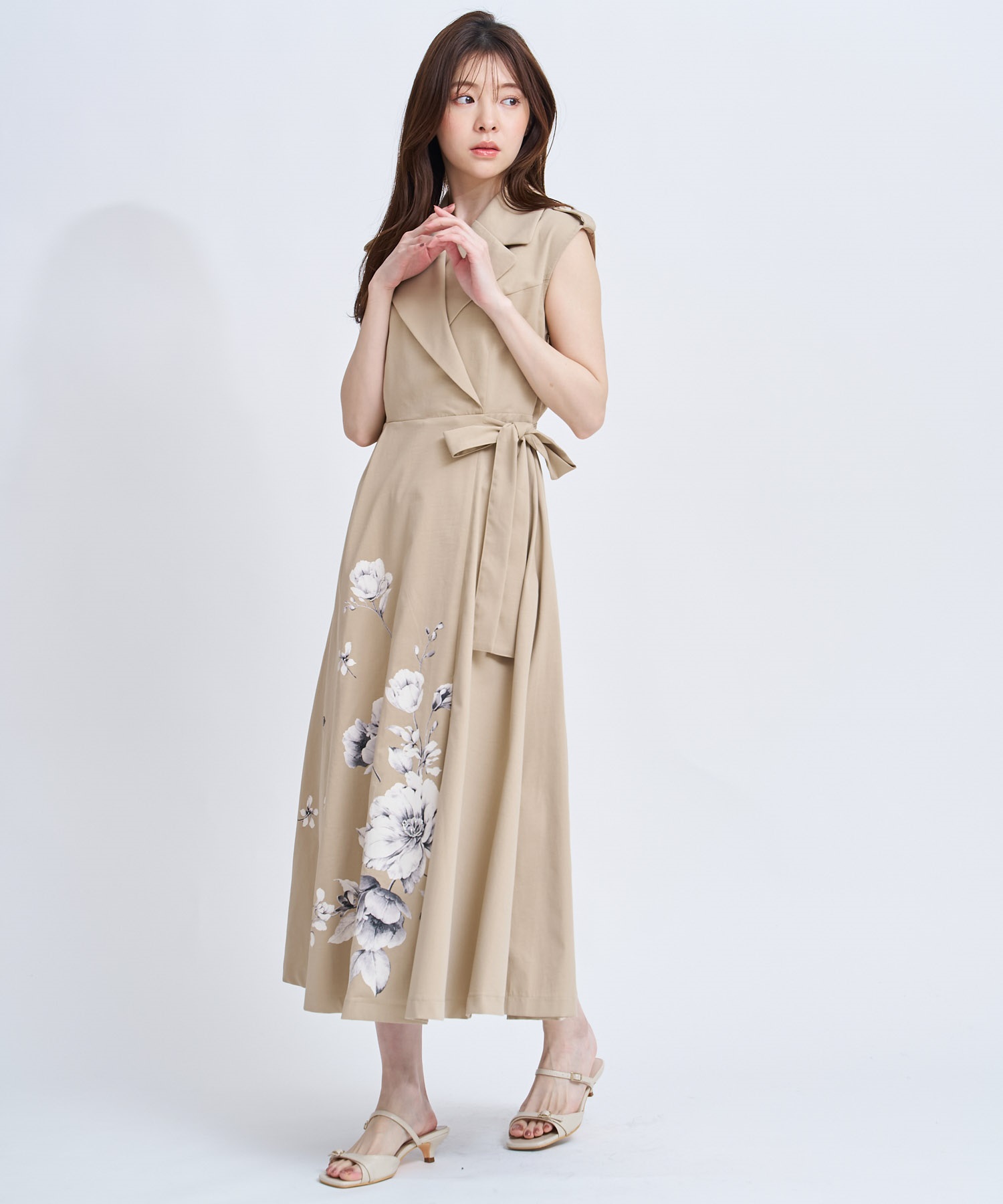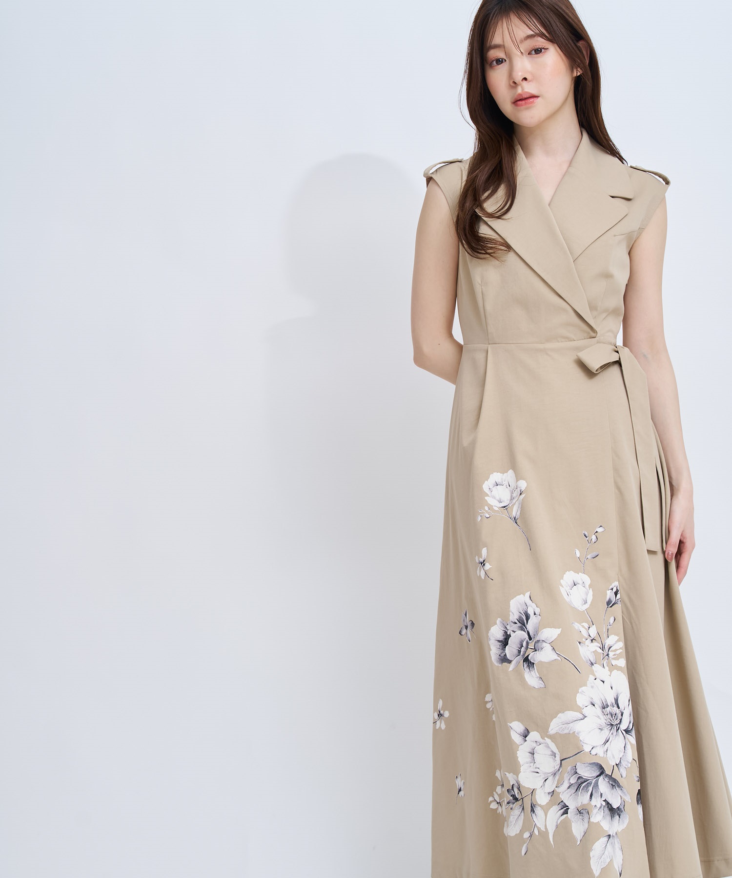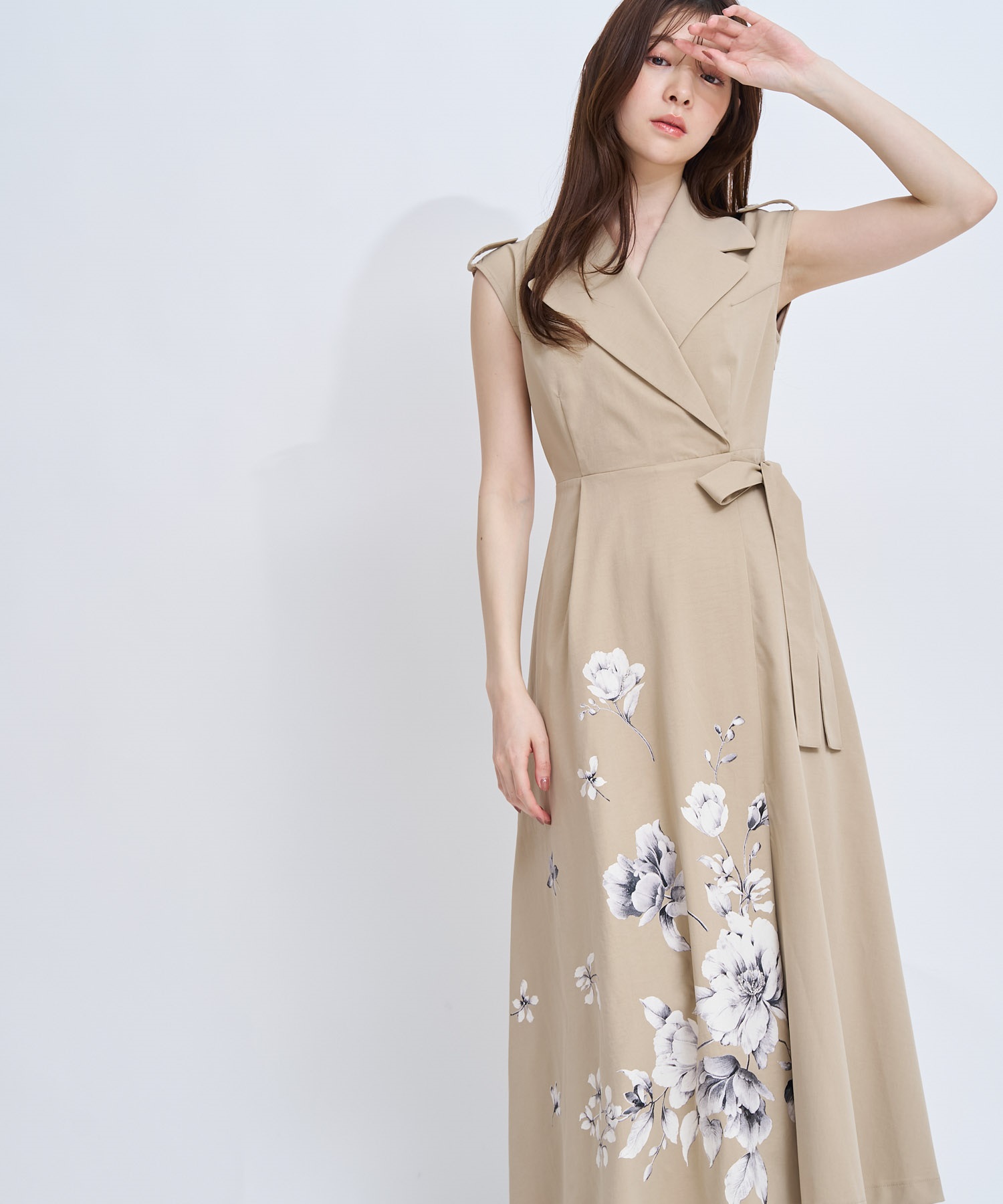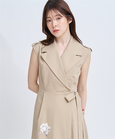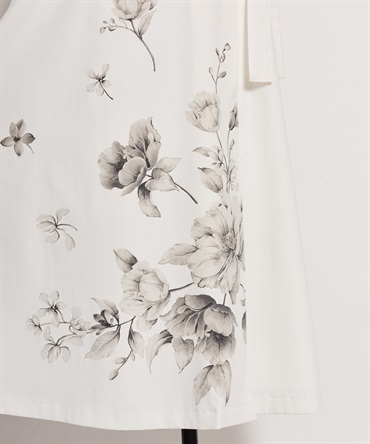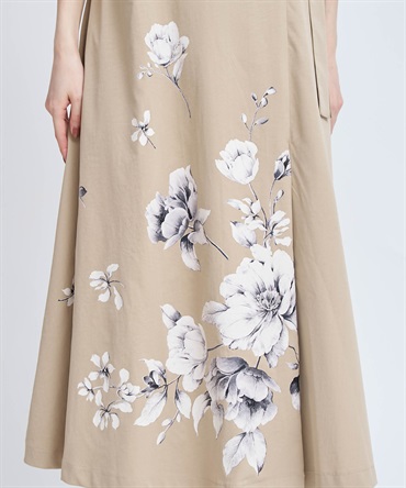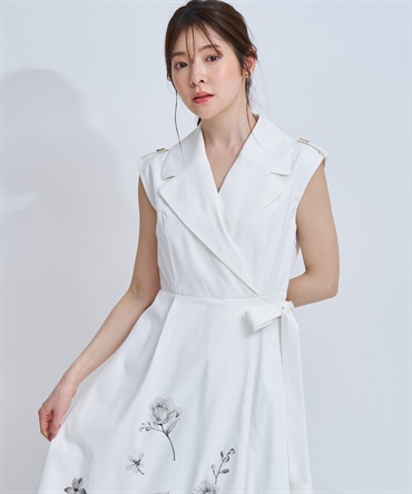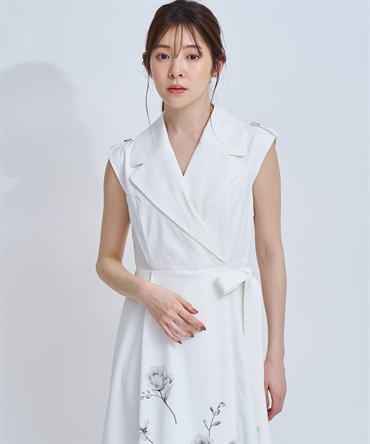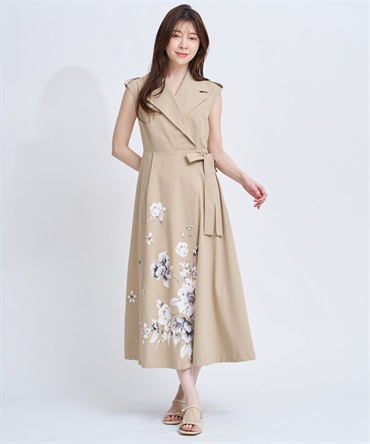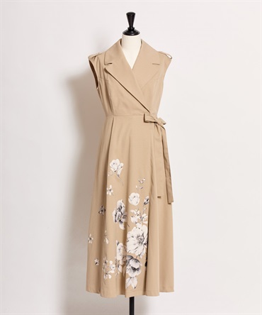 引き続きトレンドのトレンチディテールワンピースに、オリジナル花柄をパネル配置で表現。