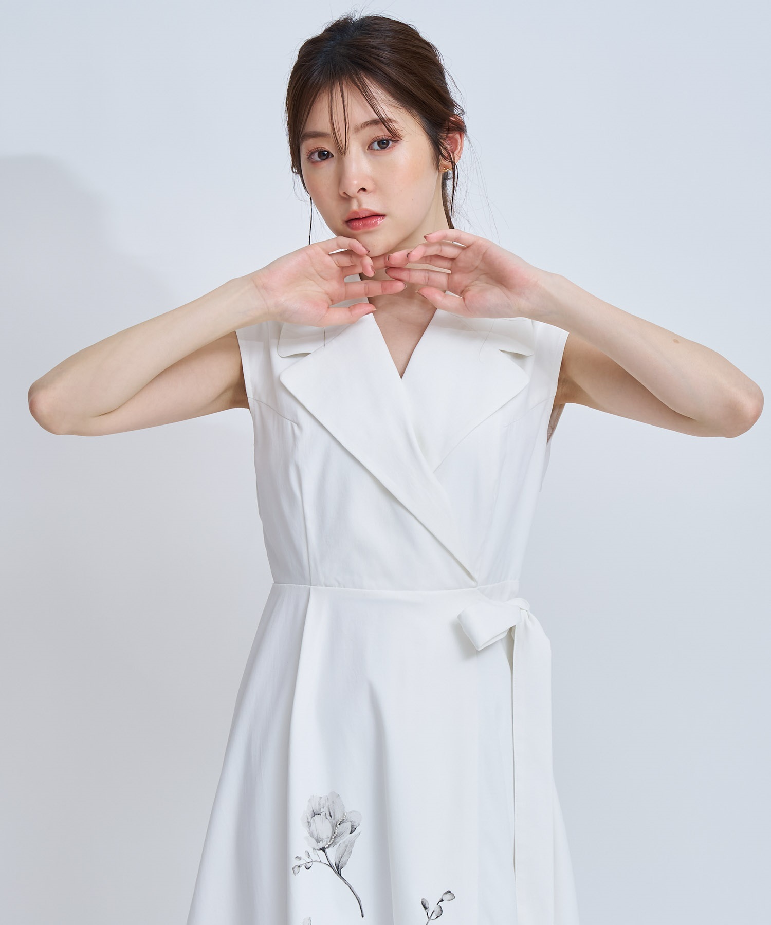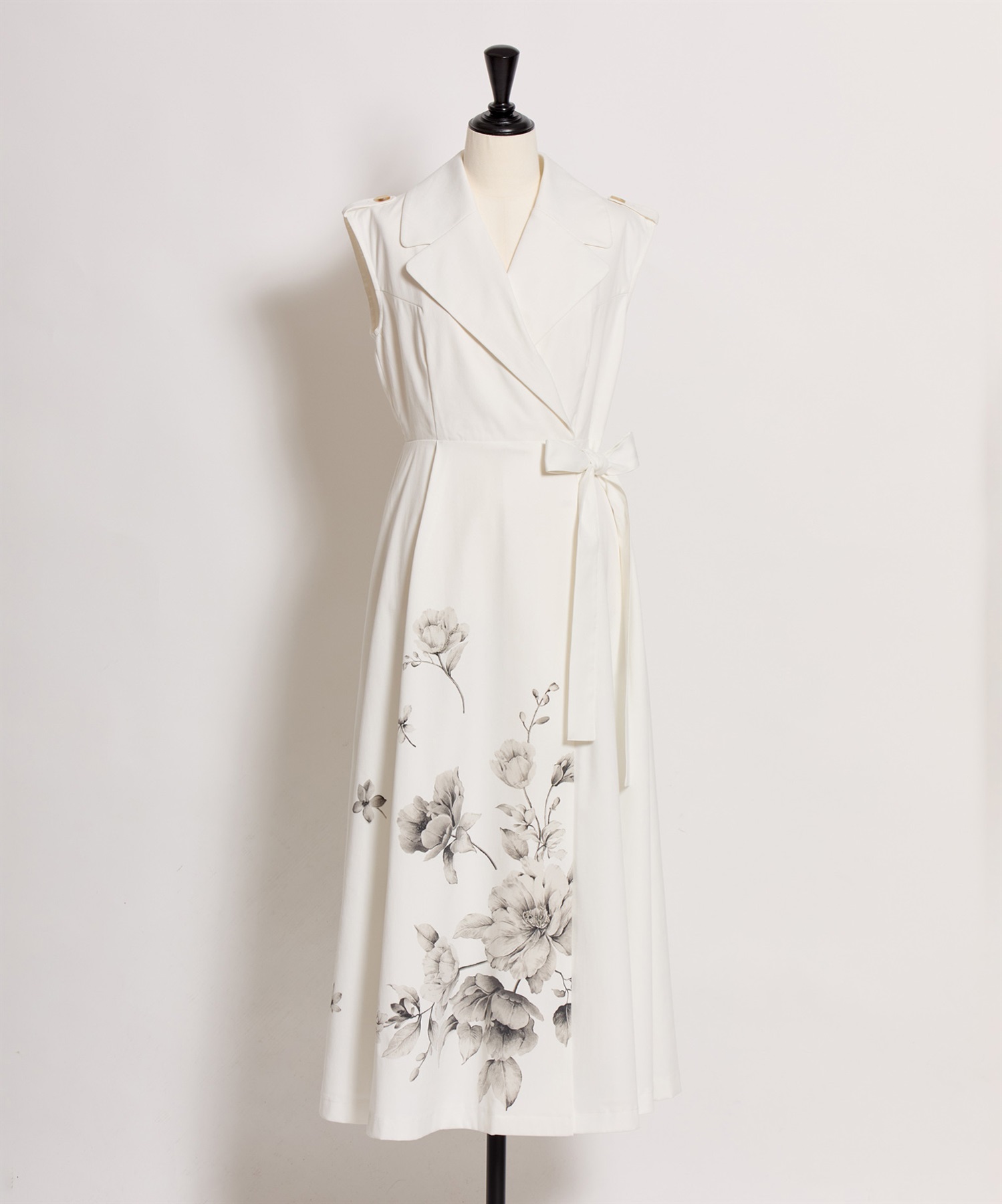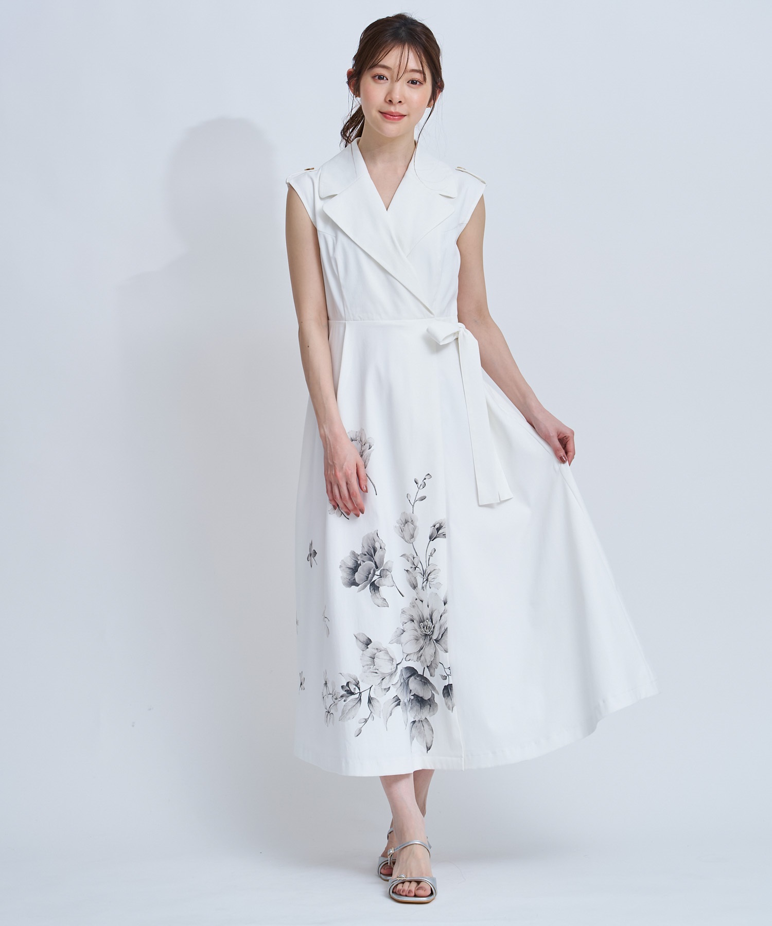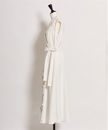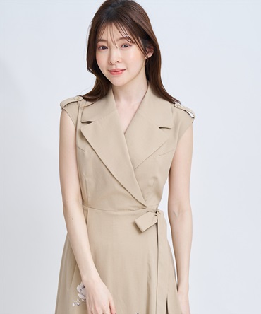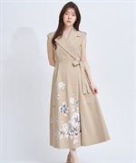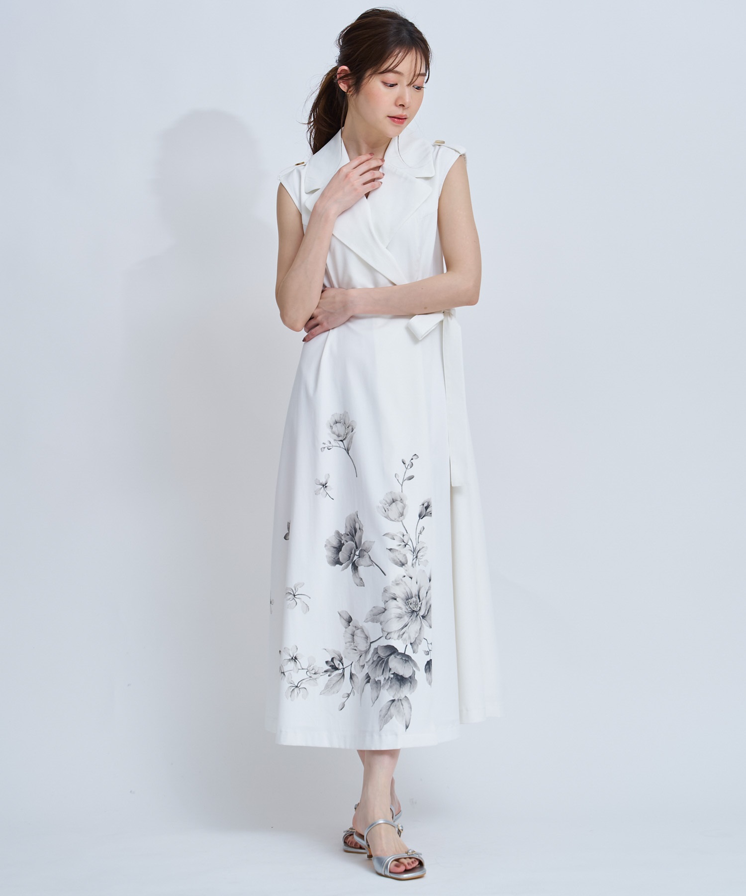 引き続きトレンドのトレンチディテールワンピースに、オリジナル花柄をパネル配置で表現。